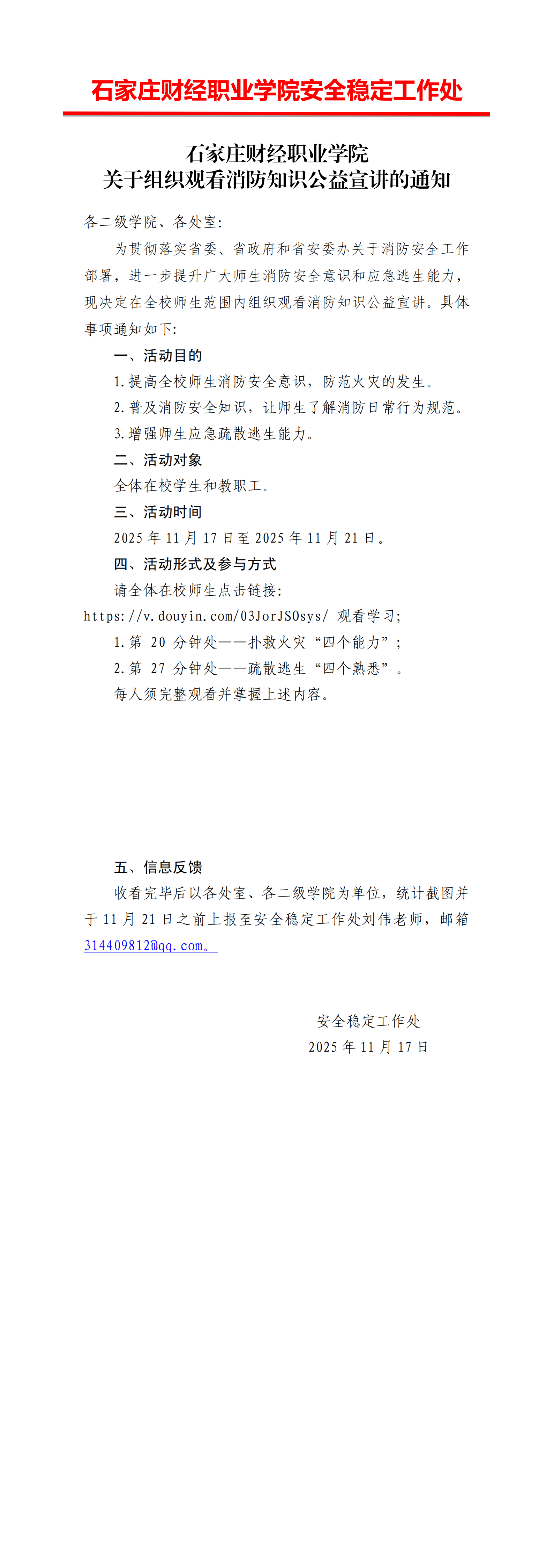BV伟德官方网站 关于组织观看消防知识公益宣讲的通知