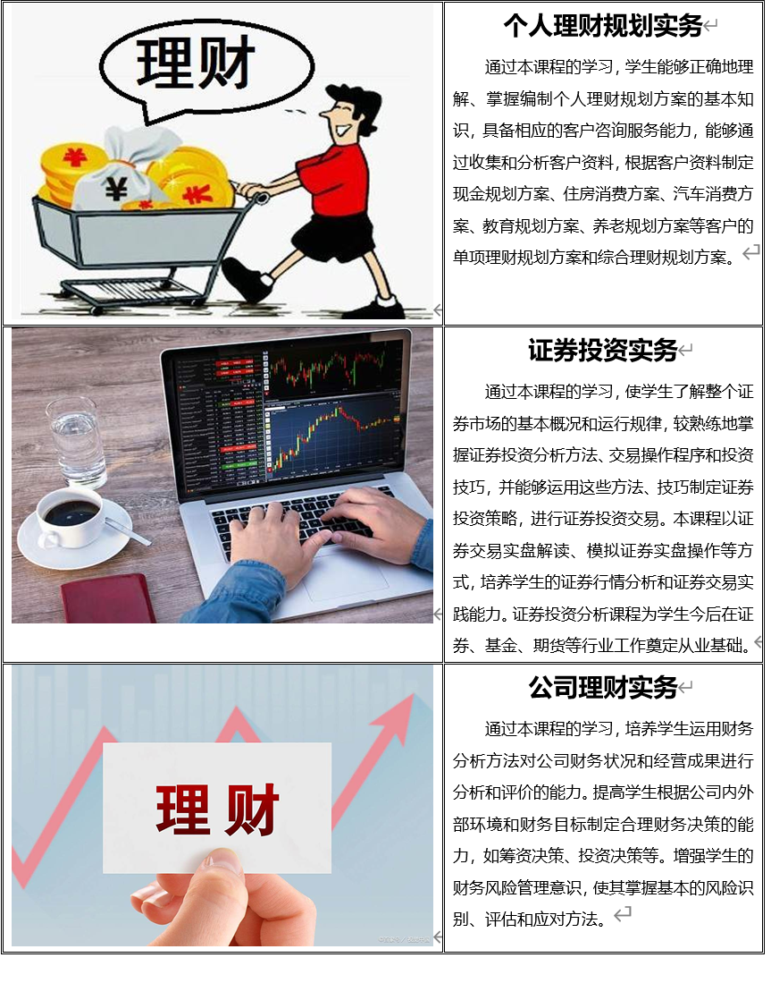 财富管理专业已与多家金融机构签订校企就业合作协议,有效地保证了学生专业技能的实习实训。如中国人寿、北京天相财富、北京指南针投顾、河北源达投顾、招商证券等。