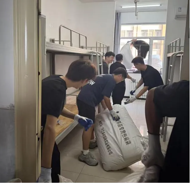 活动筹备阶段,学院党总支精准对接新生住宿信息,提前梳理各楼栋、各楼层的被品数量与分配清单,制定“分楼栋、定区域、包楼层”的志愿服务方案。学生党员志愿者们提前熟悉新生宿舍分布,以小组为单位,有序前往指定地点领取新生被品。搬运过程中,志愿者们分工协作,或手提、或肩扛,仔细核对每一套被品的信息标签,确保准确送达对应宿舍,并将被品整齐摆放至宿舍床位,同时顺带检查宿舍内基础设施情况,及时反馈需调整的细节问题,用严谨与耐心为新生打造“拎包入住”的便利条件。