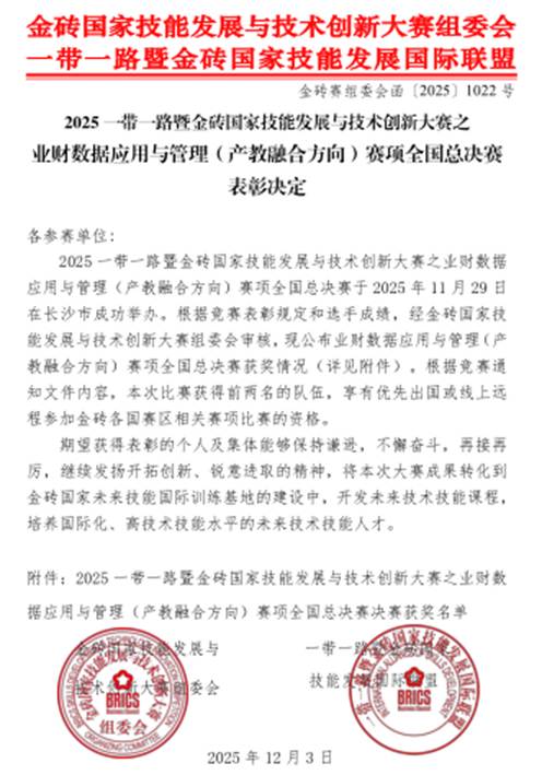 “此次获奖是团队共同努力的结果,更是学校深化产教融合、推进财经类专业数字化转型的生动体现。”未来学校将以本次大赛为契机,进一步优化业财融合相关课程体系,加强与行业头部企业的合作,引入更多真实业务场景与数据资源,培养更多既懂财务又善数据、兼具理论素养与实践能力的复合型人才,为“一带一路”及金砖国家产业发展贡献教育力量。