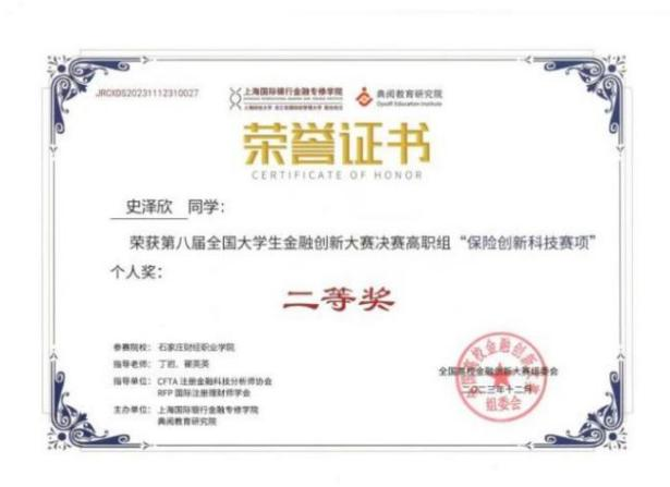 第八届大学生金融创新大赛决赛高职组“保险创新科技赛项”个人二等奖