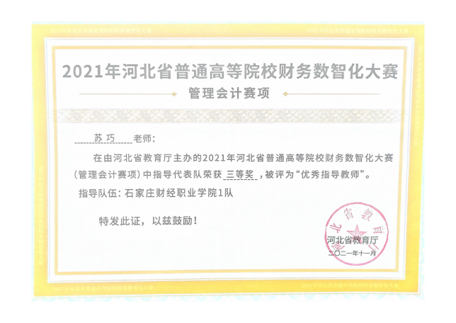 2021年河北省普通高等院校财务数字化大赛(管理会计赛项)中指导代表队三等奖