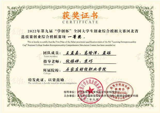 2022年第九届“学创杯”全国大学生创业综合模拟大赛河北选拔赛创业综合模拟赛项一等奖