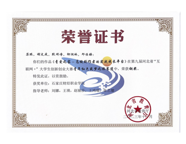 第九届河北省“互联网+”大学生创新创业大赛青年红色筑梦之旅赛道 铜奖