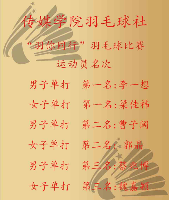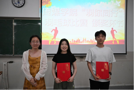 为了落实国家“健康管理年”活动实施方案,2025 年 9 月 16 日,传媒学院赶考社区精心策划了一场 “羽你有约” 专项比赛。此次活动旨在深入贯彻落实国家“持续推进体重管理年行动”号召,推进全民健身与健康管理深度融合。此活动历时3天、汇聚三十余位选手。赛事中,学生们尽展运动风采,传递健康理念。自开赛以来,男单与女单赛场始终洋溢着热烈的竞技氛围。选手们在赛场上化身灵动的追光者,一次次精彩对决扣人心弦。李一想同学凭借迅猛的杀球与稳健的防守,在多轮淘汰赛中过关斩将,锁定男单冠军。梁佳祎同学在决赛中面对郭晶同学的强力挑战,她巧妙运用拉吊战术,最终凭借更胜一筹的耐力与技巧登顶女单冠军宝座。赛场上,每一次起跳扣杀的呐喊、每一个救球倒地后的坚持,都成为青春最生动的注脚,也点燃了现场观众的热情,加油助威声、掌声此起彼伏,回荡在整个场馆。