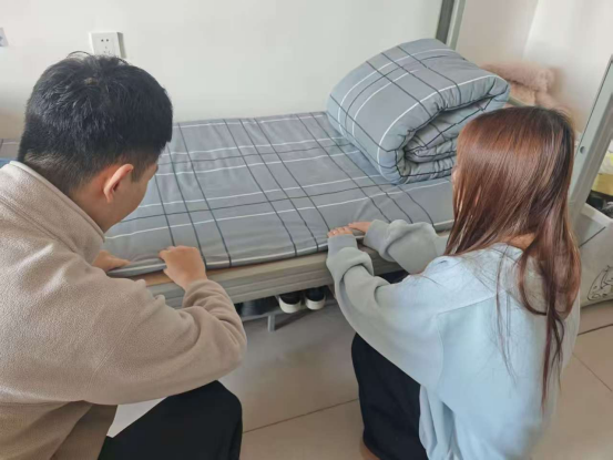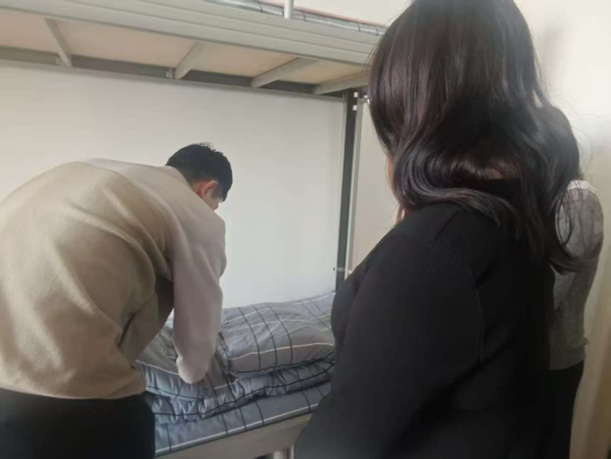 活动中,辅导员孟子涵老师深入学生宿舍,从床铺整理、物品摆放、卫生清洁等细节入手,现场示范叠被子、衣物收纳、桌面归置等规范要求,耐心讲解内务整理的标准和技巧。同学们积极响应,纷纷动手整理个人物品,将被子叠成“豆腐块”,书本、生活用品摆放整齐,地面、门窗擦拭一新。过程中,传媒学院辅导员孟子涵老师对存在的问题及时指导整改,对整理规范的宿舍给予表扬,对需要改进的地方提出具体建议并亲自进行指导整改。