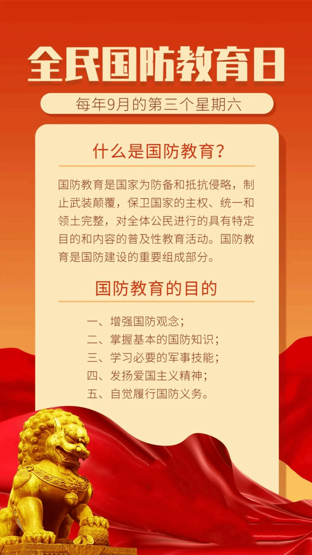 2001年8月31日,第九届全国人民代表大会常务委员会第23次会议根据《中华人民共和国国防教育法》第12条规定,决定设立全民国防教育日,并确定每年9月的第三个星期六为全民国防教育日。这是我国第一个以法律形式明确规定国防教育的主题节日。