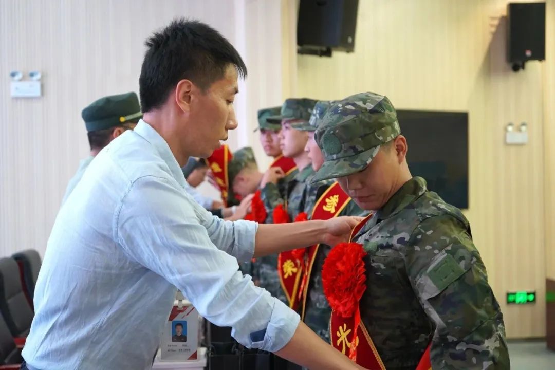 参会领导为伟德官网入伍新兵佩戴大红花,并赠送纪念品。