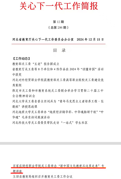 2024年12月,伟德官网关工委举办“新中国文化教育从这里走来”专题讲座一文入选河北省教育厅关心下一代第12期工作简报。