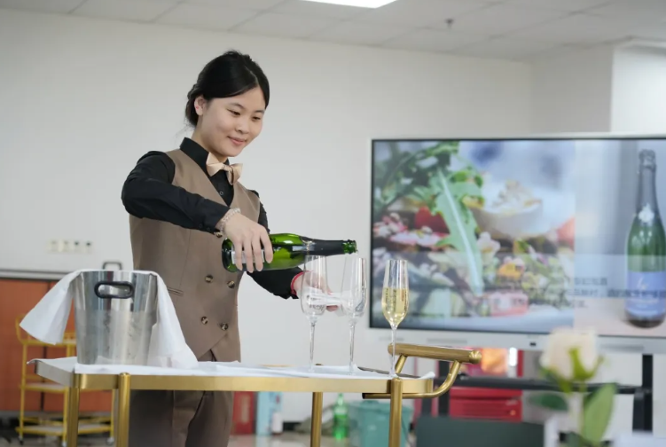 本次大赛由教育部主办,广东省教育厅倾心承办,深圳职业技术大学全力协办。其影响力如汹涌浪潮,吸引了来自全国的57支精锐之师竞相角逐。在这场激烈的技能盛宴中,经济管理学院的杨利、白晓兰两位导师,宛如智慧的灯塔,引领着王应霞、张欣芸、刘颖、贾世芳四名学子,无畏前行。他们深入钻研比赛规则,匠心独运地以 “醇香桥梁、智汇未来” 酒庄晚宴之形式,将调酒、侍酒与品鉴模块内容巧妙融合,犹如奏响一曲美妙的技能交响乐,让观众和评委们为之倾倒。