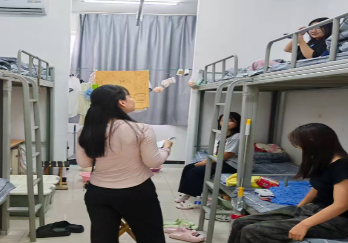 新生们在辅导员的带领下,开启了一场宿舍劳动教育。辅导员从个人床铺整理、书桌收纳,到宿舍公共区域清扫,逐项指导新生开展宿舍劳动。