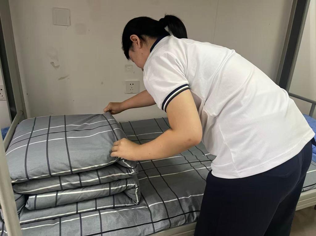 除了叠被子,辅导员还针对物品摆放、卫生清洁等方面进行细致指导。“书桌要分区,常用的书本放在桌面右侧,文具放进收纳盒,私人物品要摆放整齐,不能随意堆放。”“洗漱用品要按顺序排列,毛巾挂在指定位置。” 辅导员们逐床检查,对不符合规范的地方及时指出,并现场示范正确的整理方法。新生们认真聆听,积极按照要求调整,原本略显杂乱的宿舍渐渐变得窗明几净、井然有序。