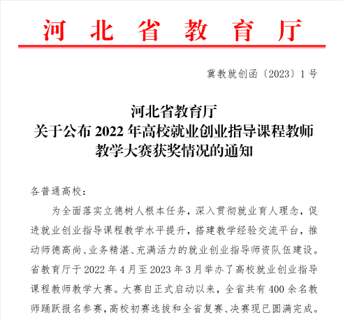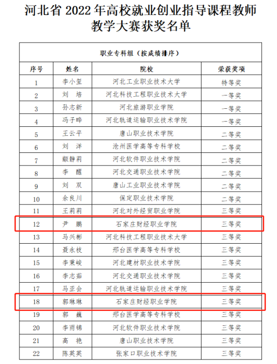 近日,河北省教育厅公布了2022年高校就业创业指导课程教师教学大赛获奖名单,伟德官网尹鹏、郭琳琳两位教师荣获三等奖。