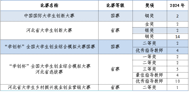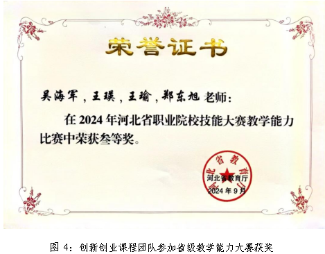 2024年,教师团队获得河北省职业院校技能大赛教学能力比赛三等奖;教师团队中4人被列入中国国际大学生创新大赛评审专家库,多次参与国赛网络评审。