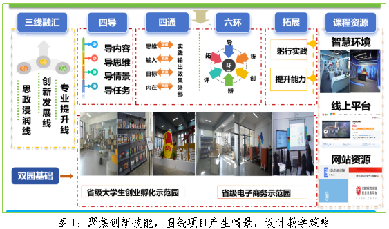 将岗位要求、大赛标准、1+X证书、职业资格证书内容等融入课程,以教学案例项目为起点、以真实创新项目为终点,构建了“双园三线、四导四通、六环递进”教学模式,达成一条基于岗位需求的集专创融合为一体的创新技能赋能专业教育的人才培养之路。目前学校开设“专创融合”课程 34 门,建有直播间、创业空间等专创实训室 22 个,实现了创新创业教育全覆盖。