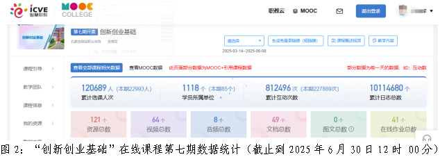 建设《创新创业基础》省级精品在线课程,引导学生随时随地跨越时空进行学习。截至目前,课程已开设7期,累计选课人数120689人,学员所属单位1118个,活跃用户数量占课程注册使用人数比例达到80%以上。