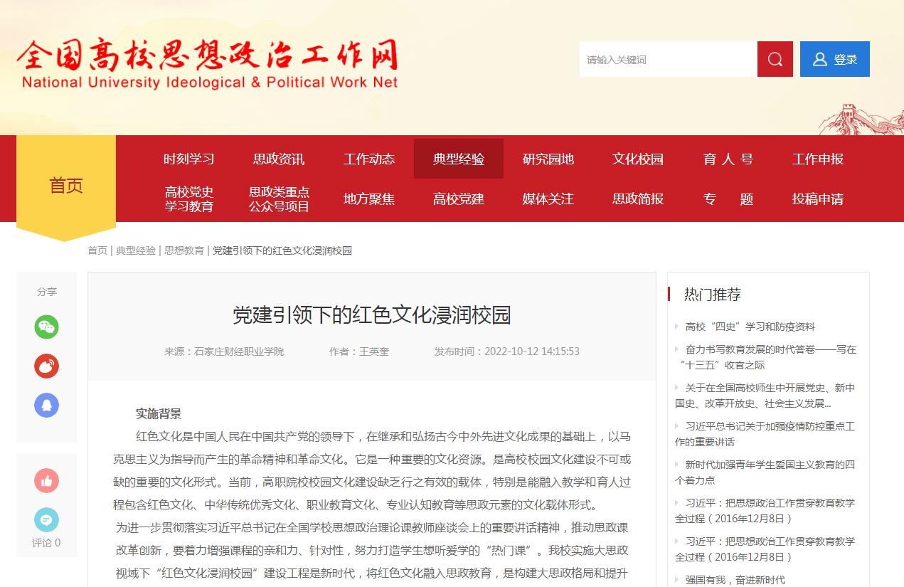 2022年10月12日,“全国高校思想政治工作网”以“典型经验”刊发了伟德官网红色文化育人典型案例《党建引领下的红色文化浸润校园》(https://www.sizhengwang.cn/a/dxjy_sxjy/221012/1137430.shtml)