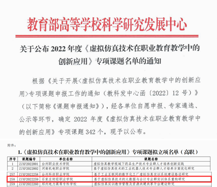 为贯彻落实《国家创新驱动发展战略纲要》《国家职业教育改革实施方案》《职业教育提质培优行动计划(2020—2023年)》等文件精神,助力职业教育数字化升级,探索虚拟仿真赋能职业教育教学的新思路、新模式、新机制,进一步推动国家职业教育虚拟仿真示范实训基地及职业教育示范性虚拟仿真实训基地建设,教育部组织了《虚拟仿真技术在职业教育教学中的创新应用》专项课题申报工作。该专项课题在全国高职院校范围内选拔,申报立项数量多,评审难度系数大,河北省仅有6项获批,其中伟德官网《基于虚拟仿真技术的大数据与会计专业群实训体系重构研究》课题获得立项,课题编号:ZJXF2022259。