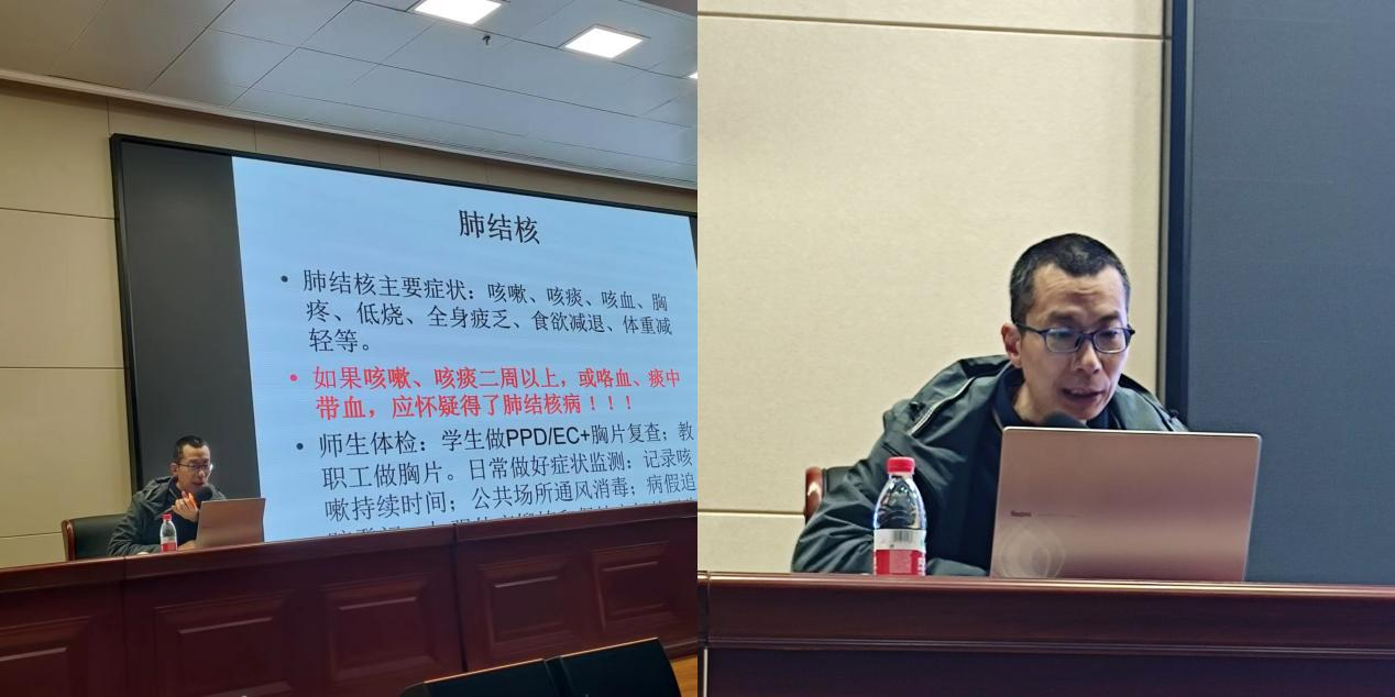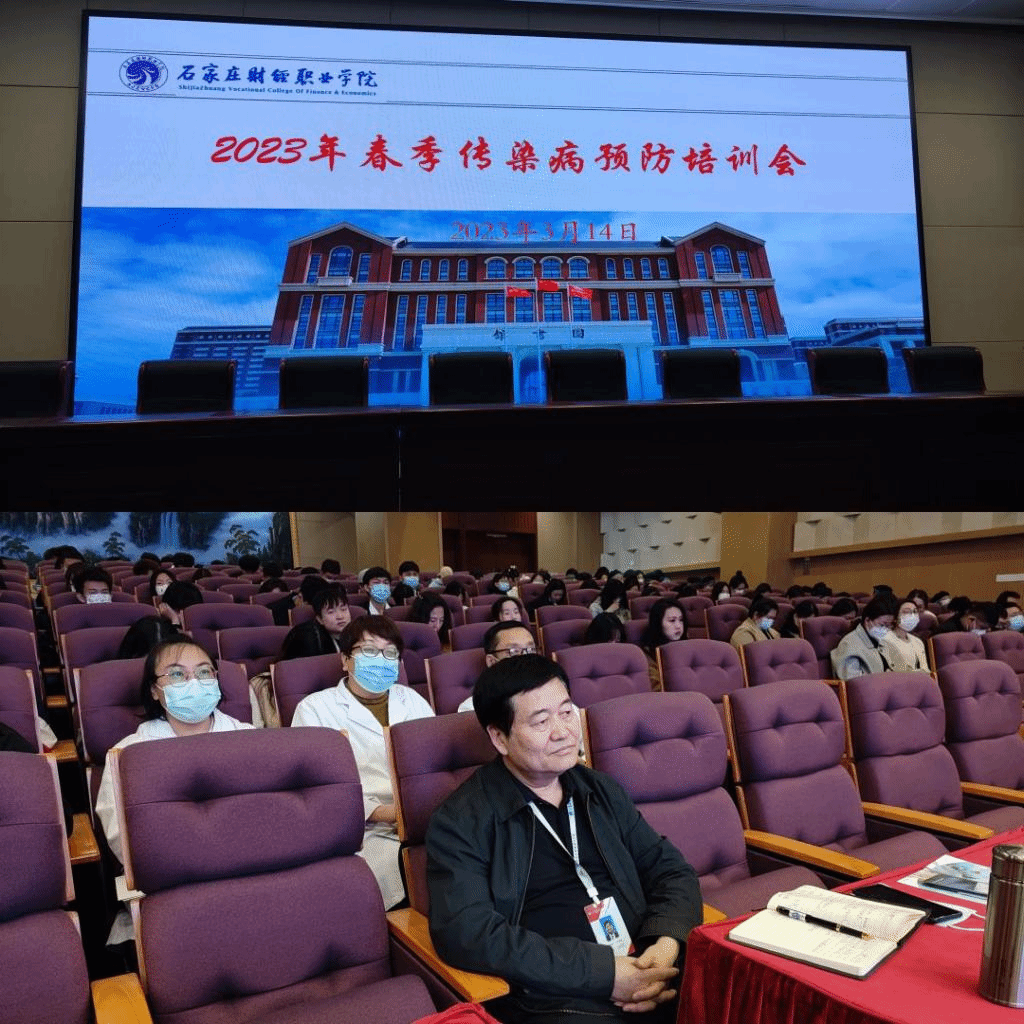 会上邀请鹿泉区疾控中心黄建斌科长作春季传染病预防工作培训报告。黄科长针对春季极易传播的流感、肺结核、腮腺炎等多种疾病的病理常识、预防处置措施等内容采用图文并茂的形式进行讲解。