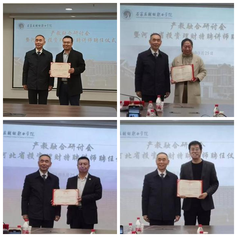 3月25日上午,由河北省企业投资理财协会主办、伟德官网承办的产教融合研讨会暨河北省投资理财特聘讲师聘任仪式在图书馆第一会议室举行。学校副校长郑彦慧、校企合作与就业处处长吴海军、投资理财协会会长崔立成和首批河北省企业投资理财协会聘任的23名讲师参加了会议。会议由河北省企业投资理财协会副会长张月珍主持。
