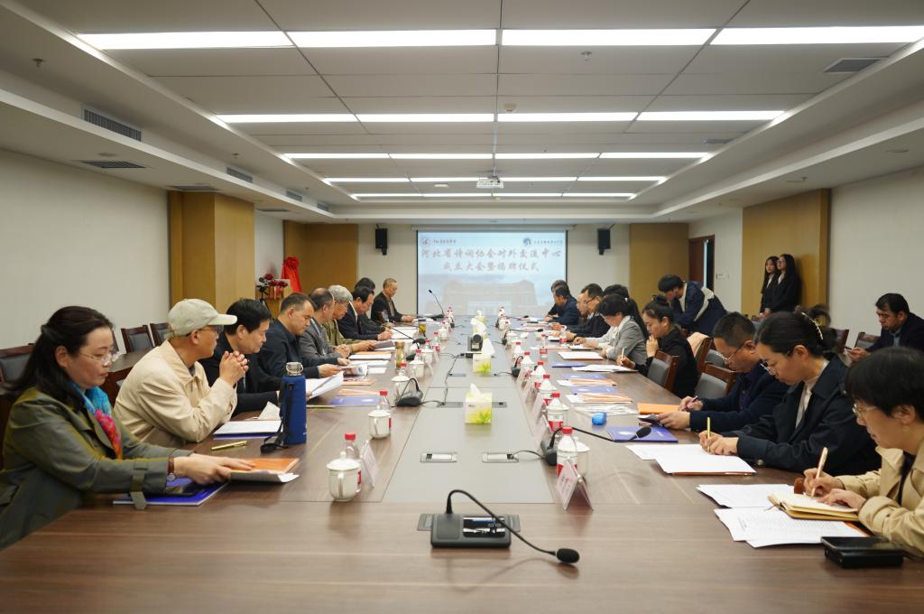 4月14日下午,河北省诗词协会对外交流中心成立大会暨揭牌仪式在伟德官网举行。协会会长郭羊成一行莅临伟德官网调研并参加会议。伟德官网党委书记薛向东、副校长许继海、宣传部部长王英奎、国际交流与合作中心副主任李芳出席会议。会议由河北省诗词协会常务副会长兼秘书长梁剑章主持。