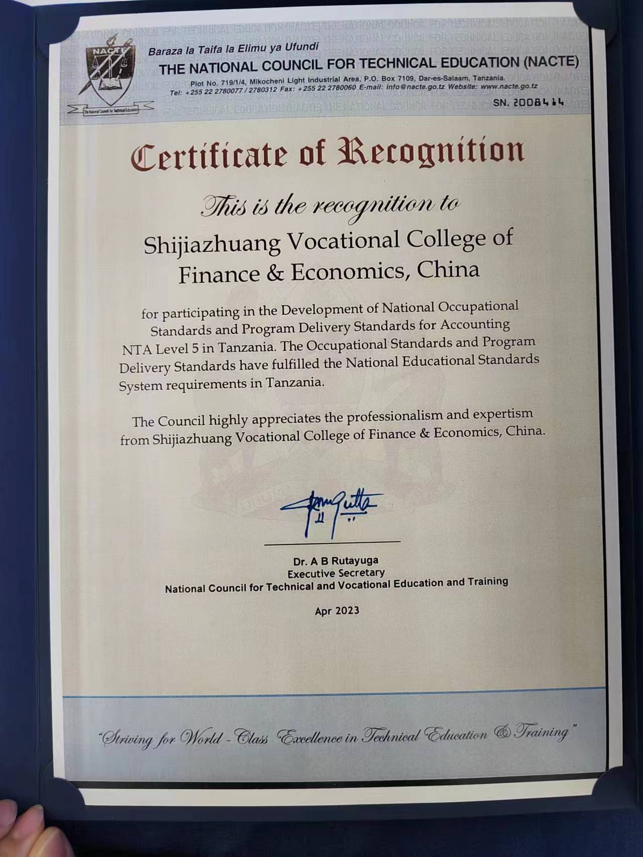 坦桑尼亚国家职业教育委员会执行秘书阿道夫·巴比利吉·鲁塔尤加博士(右一)为第二批坦桑尼亚国家职业认证首批单位颁发认证证书