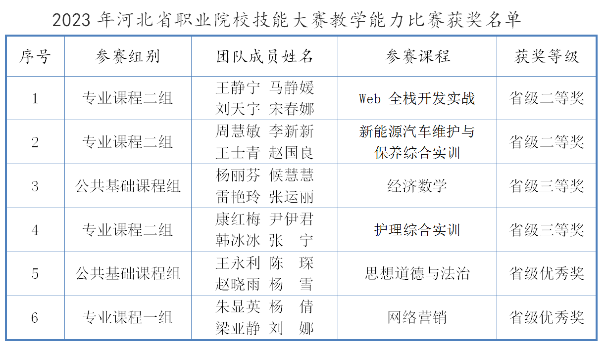 近日,河北省教育厅发布了2023年河北省职业院校技能大赛教学能力比赛结果,伟德官网再创佳绩!荣获二等奖2项、三等奖2项、优秀奖2项。