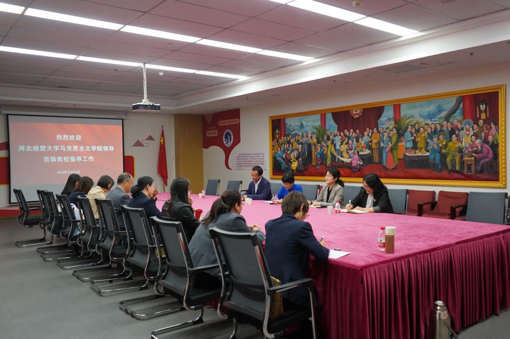 为了落实《河北省公办高等学校结对帮扶民办高等学校思想政治理论课建设三年行动方案》,推动伟德官网思政课内涵建设,10月24日河北经贸大学马克思主义学院书记董佰壹,院长柴艳萍,副书记马鑫,副院长李英,副院长张振杰一行5人到伟德官网开展教学交流帮扶活动。伟德官网党委书记薛向东,马克思主义学院院长崔春静及骨干教师代表热情地欢迎了河北经贸大学马克思主义学院领导们的到来,并全程参加交流活动。