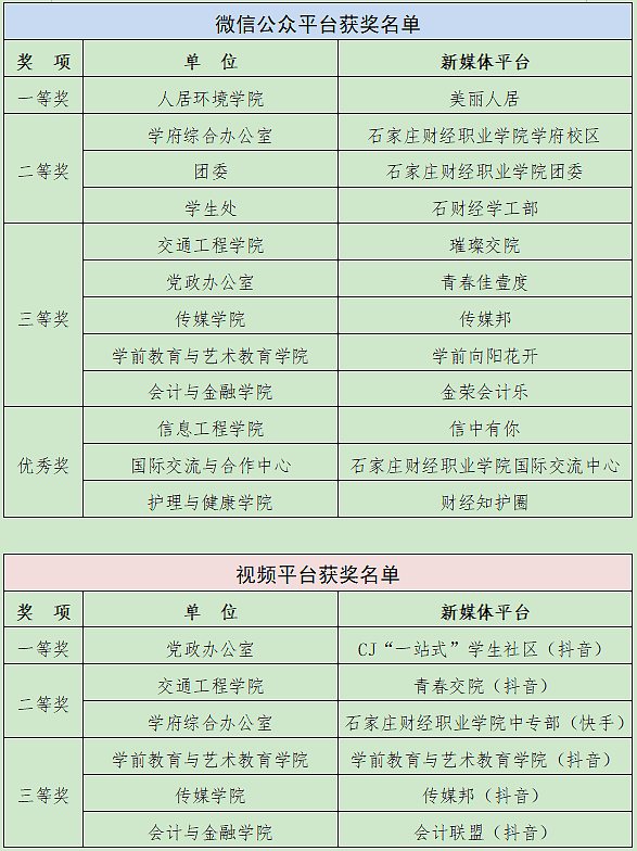 本次评选分为微信公众平台、视频平台两个组别,邀请五位评委现场进行打分。评分标准包含了运维状态,整体传播力,最佳单篇,文案、视频质量,版面呈现,互动呈现等多个维度。各平台负责人主要从运营基本情况、运营模式、内容建设、特色成果等方面进行展示,并分享了各自的经验收获。经评委评审,最终评选出优秀微信公众平台一等奖1个,二等奖3个,三等奖5个,优秀奖3个;优秀视频平台一等奖1个,二等奖2个,三等奖3个。(见下表)评委现场为获奖者颁发了荣誉证书及奖金。此外,还为学校官方微信公众号本年度转发先进个人颁发了奖金和荣誉证书。