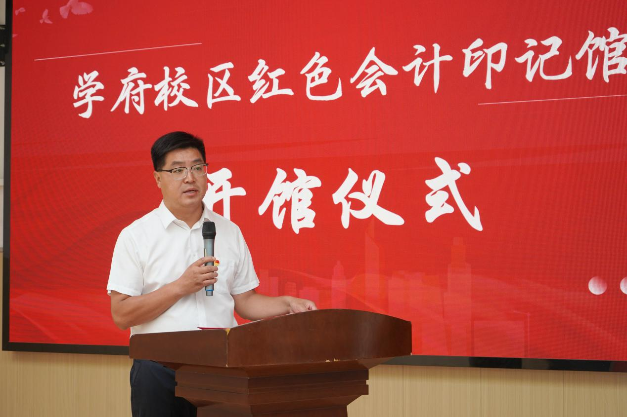 副校长王永利致辞。他强调,红色会计印记馆的建设旨在传播“红色会计”文化,传承红色基因,充分展示“红色会计”的奋斗史和成功案例引导和帮助学生们充分感悟党史底蕴,进一步筑牢专业知识基础,树立强烈的职业责任感。这也是学校探索与党史学习教育、课程思政教学、金融学科建设三个领域工作相融合新路,期待印记馆能够成为传播财经文化、弘扬红色精神的重要窗口,为推动社会主义文化大发展大繁荣做出积极贡献,为建党103周年献礼。