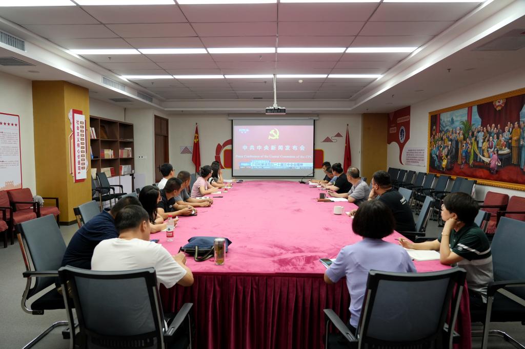 会上,全体参会人员观看新闻发布会,宣传部部长领学《中国共产党第二十届中央委员会第三次全体会议公报》和《中共中央关于进一步全面深化改革、推进中国式现代化的决定》。