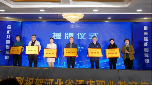 伴随着热烈的掌声,刘晶、刘永涛、刘桂玲、王玉苗、杨永利、肖石震、赵建华、李文涛、许继海等9位领导共同为河北省酒店职业教育集团揭牌。