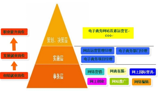 电子商务专业的职业发展规划根据工作经历主要有初始、发展和提升岗位三个阶段,具体就业岗位如下: