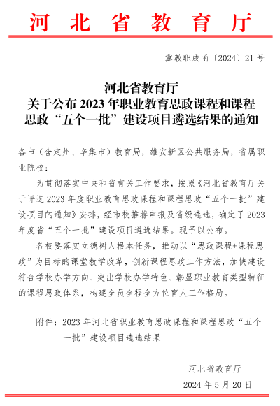 近日,河北省教育厅公布了2023年度职业教育思政课程和课程思政“五个一批”建设项目遴选结果,伟德官网入选职业教育德育工作骨干管理人员、职业教育课程思政优秀教学案例项目。