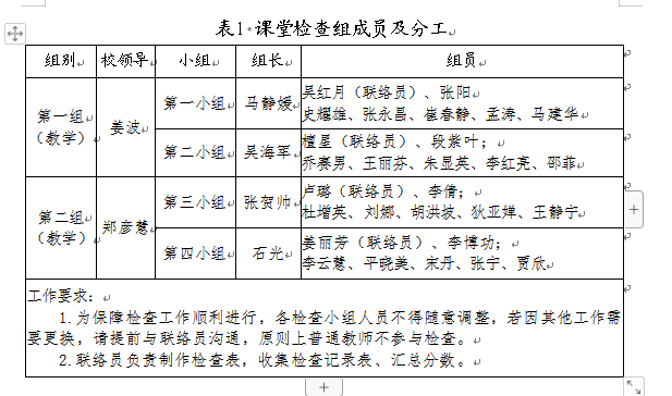 重点检查课堂教学情况、听课制度落实情况,具体分工情况如表1所示。具体检查时间各组根据情况确定。