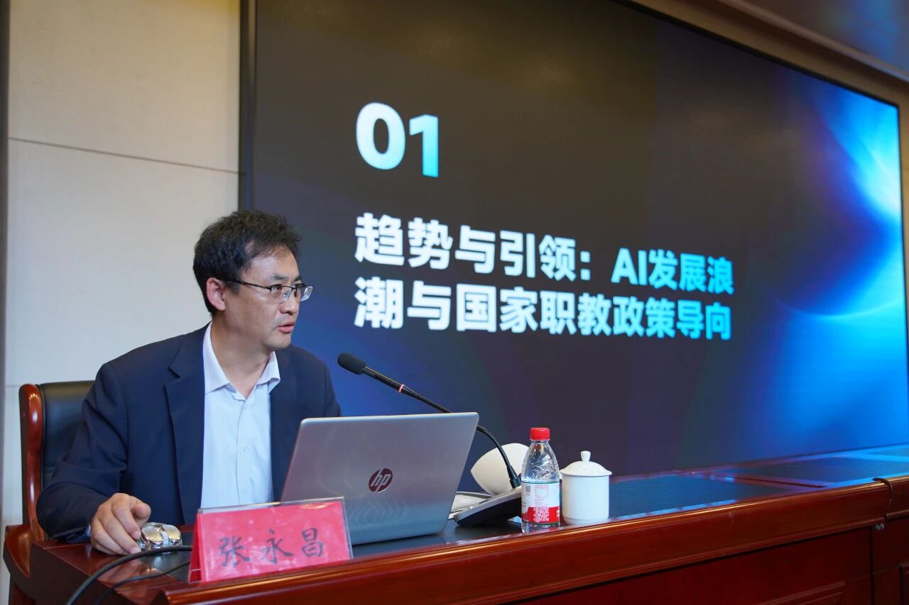 信息工程学院院长张永昌教授围绕《拥抱AI,与时代同行》主题,结合2025年世界人工智能大会最新动态与国家“人工智能+”战略部署,分析了AI对职业教育的变革意义。他提出,AI应深度融入“教、学、评”全流程,呼吁教师强化教学设计、人机协同等核心能力,推动AI技术应用与专业建设深度融合,共创智能教育新生态。