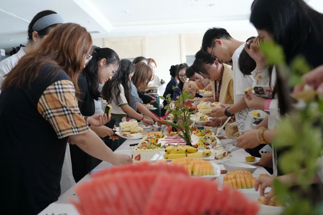 表彰大会后,校领导与教师移步茶歇区,共同分享节日蛋糕,分享甜蜜与喜悦。现场准备了精美点心、水果和饮品,教职工们畅叙情谊、合影留念,洋溢着浓浓温情。