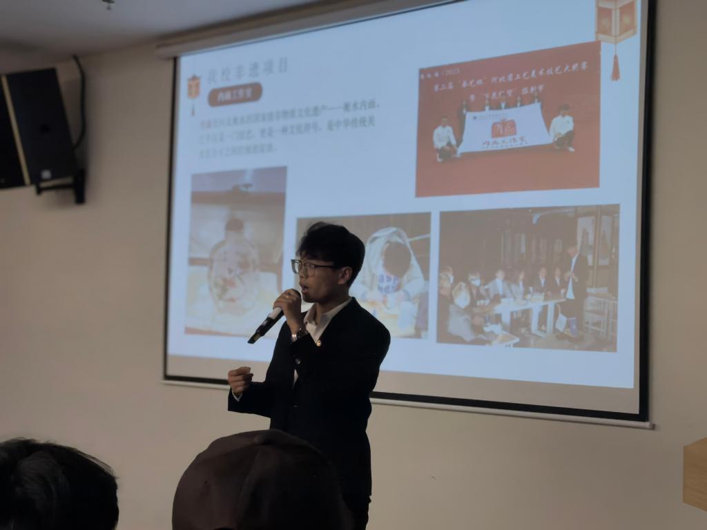讲座开篇,队长从非遗文化的历史价值切入,用通俗生动的语言阐释了非物质文化遗产作为“民族文化基因”的核心意义。队长结合自身传承经历,鼓励同学们主动走近非遗、了解非遗,在学习技艺的过程中感受传统文化的魅力,成为非遗传承的“青春代言人”。谈及伟德官网非遗文化建设成果,重点介绍了舞龙、内画、舞狮、剪纸四大特色项目。四大项目相互呼应,构建起伟德官网多元化的非遗实践体系,让同学们在课余时间就能接触、学习传统技艺。