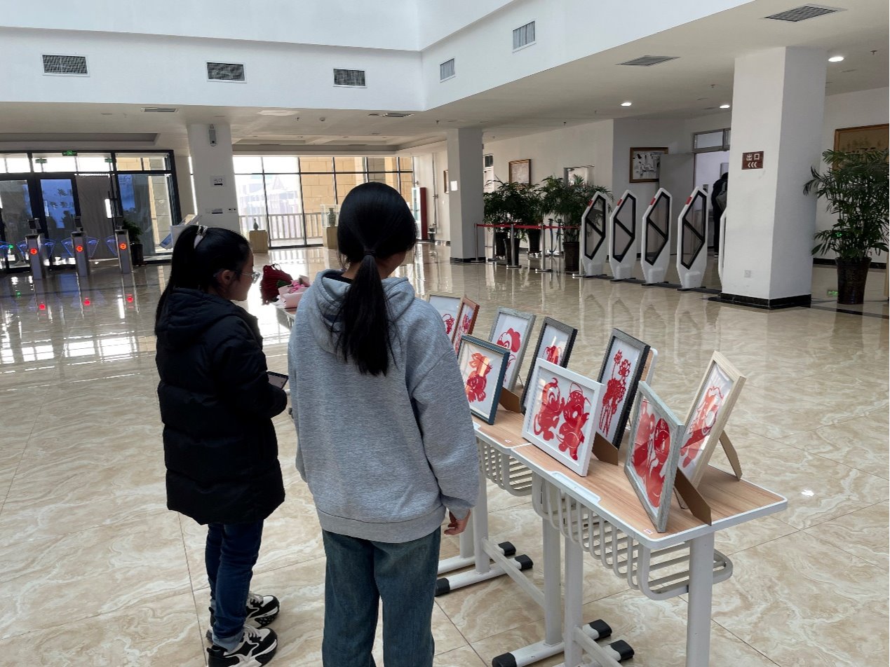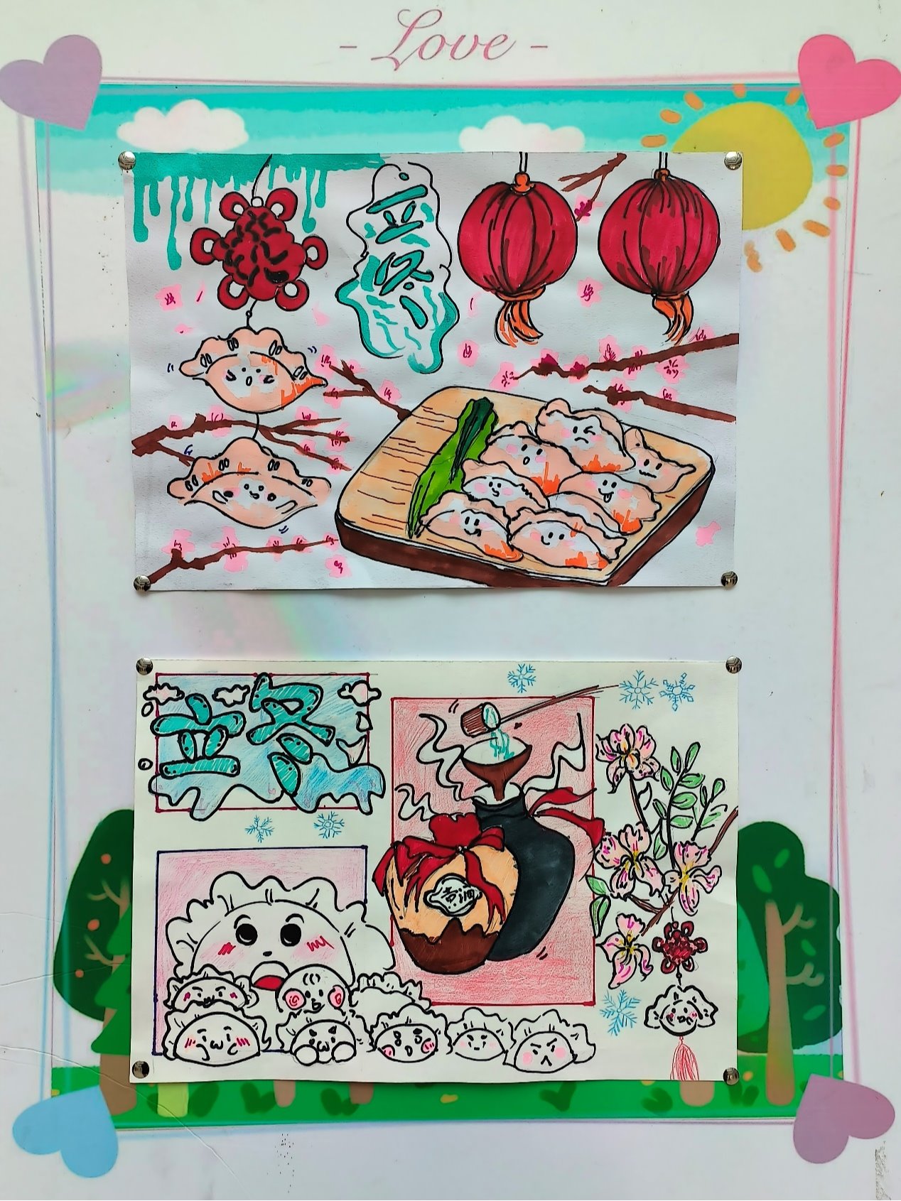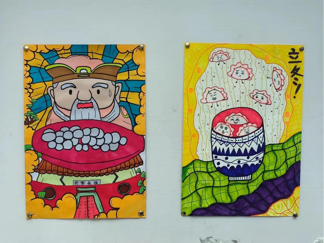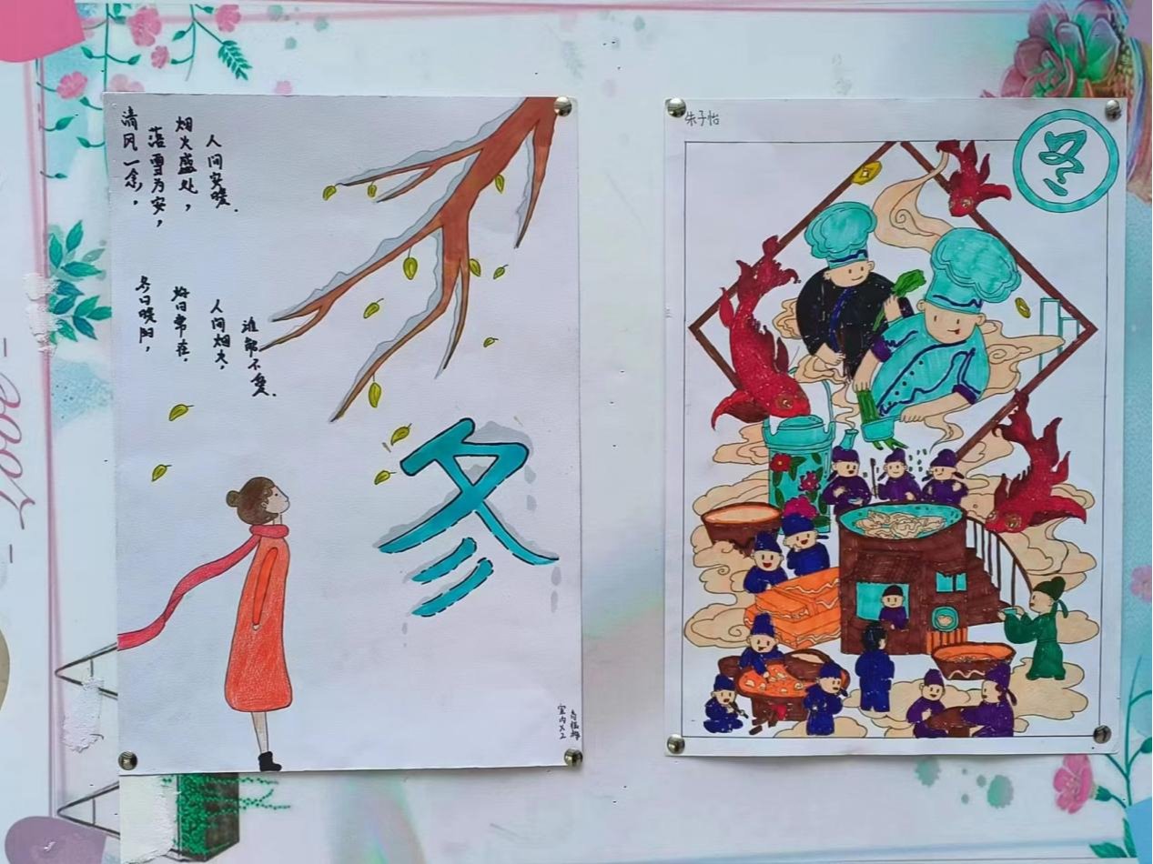为了让同学们更加直观感受立冬的氛围,德艺书画社、手工社在图书馆二楼设置以立冬为主题的作品展。