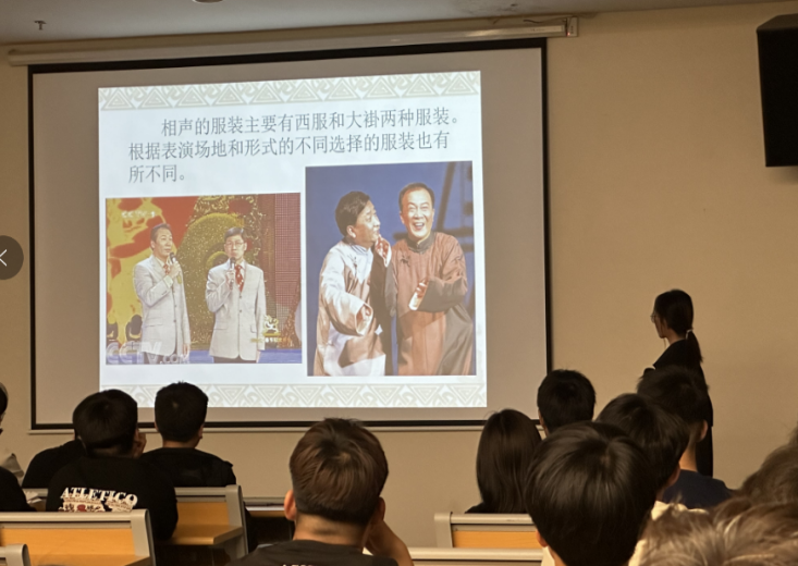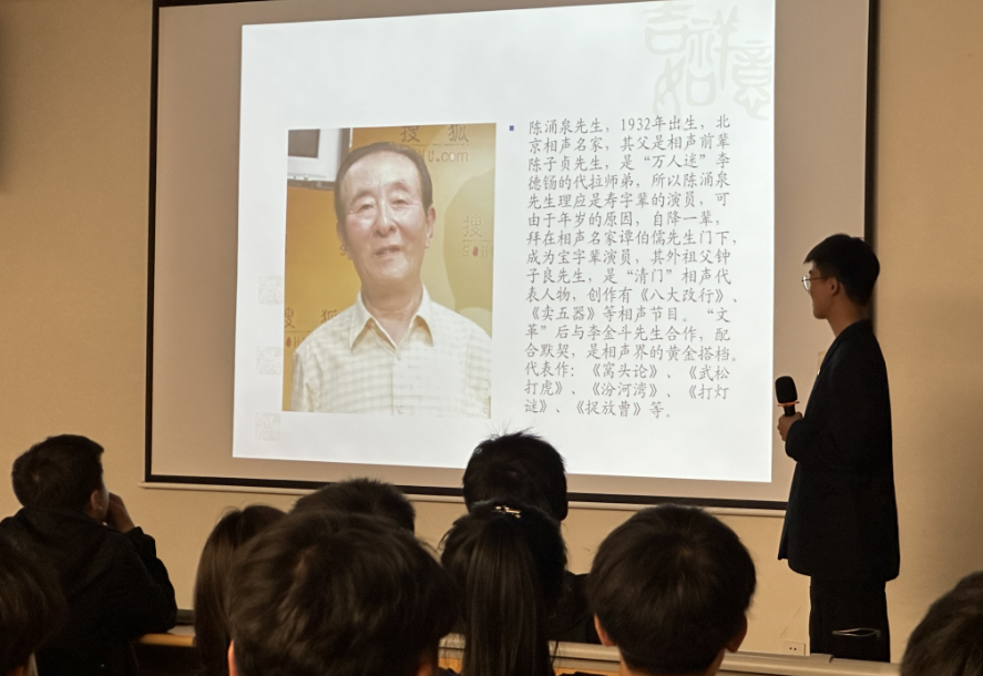 在讲座过程中曲艺社精心策划了技术讲解、经典作品赏析、现场互动体验等环节,全方位、多角度地详细介绍了相声、评书、快板等多种曲艺形式的历史渊源、艺术特点和表演技巧,让在场的观众感受到了传统曲艺的博大精深。