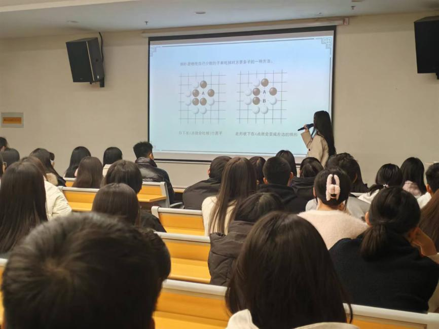 本次围棋讲座由博弈棋社围棋部部长魏安琪担任主讲,她从围棋的起源与发展讲起,带领听众穿越千年,领略围棋这一古老智慧游戏的深厚底蕴。详细介绍了围棋的基本规则、战略战术,以及如何在对局中培养思维能力和决策能力。