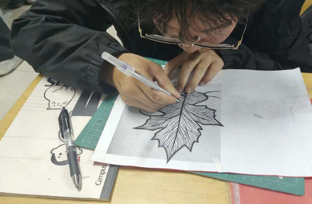 实践创作环节以“秋叶”为主题,聚焦对称剪纸技法。结合学习的技法,将对秋日的观察与对传统技艺的理解融入作品,原本普通的彩纸,在指尖流转间逐渐变成形态各异、充满生机的秋叶剪纸。