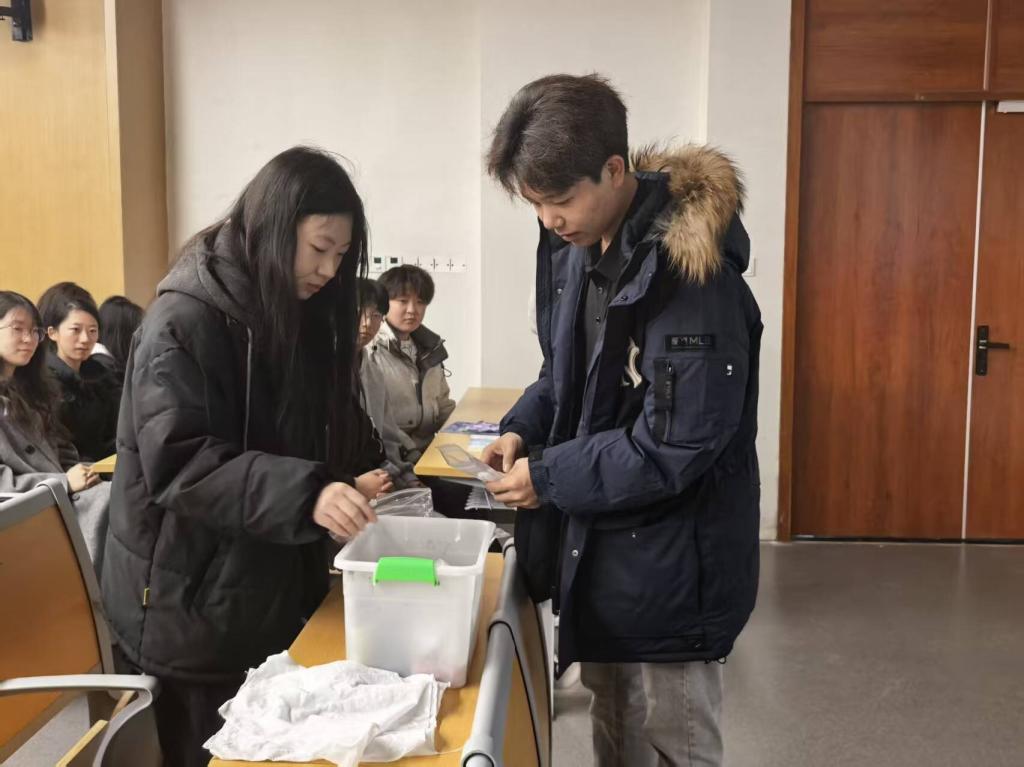 随后进入作品展示环节,一件件色彩斑斓、独具匠心的捆扎染作品依次亮相。蓝白交织的纹样、灵动鲜活的造型,不仅直观呈现了社员的学习成果,更彰显出青年学子的创造活力与艺术巧思。作品展示后,学生们开启动手实践,大家充分发挥创意,将理论知识融入捆扎、浸染操作,在一针一线的捆结、一浸一染的晕色里,实现理论与实践的深度融合,切身感受传统手工艺的创作魅力。