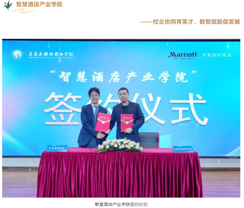 学校与全球酒店业巨头——万豪国际集团携手合作,共建智慧酒店产业学院。产业学院凭借其在行业引领的先进性、智慧技术的高水准、服务产业发展的强效能以及人才培养的高质量,通过构建高水平的教学与实践平台,为酒店行业的智能化转型与持续繁荣,不断培养具备超前洞察力、卓越创新思维及精湛实战技能的高素质酒店管理人才。