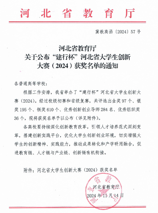 近日,河北省教育厅公布了《关于公示“建行杯”河北省大学生创新大赛(2024)获奖名单》,伟德官网参赛团队在“青年红色筑梦之旅”和“职教赛道”共获得2金2银14铜的佳绩,创造了历年来省级决赛最好成绩,同时“职教赛道”2个金奖项目顺利入围国赛,获奖比例及个数再创历史新高。