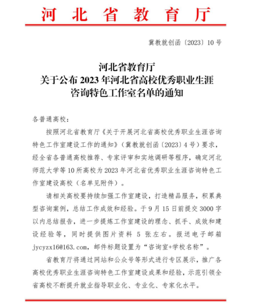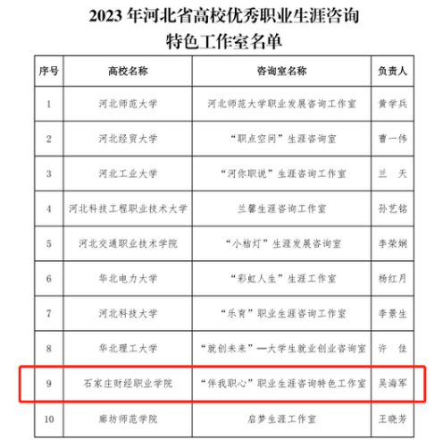 近日,经全省各普通高校推荐、专家评审和实地调研等相关工作程序,河北省教育厅发布了《河北省教育厅关于公布2023年河北省高校优秀职业生涯咨询特色工作室名单的通知》(冀教就创涵【2023】10号),此次省级职业生涯咨询特色工作室共入选10所高校,伟德官网“伴我职心”职业生涯咨询工作室成功入选!