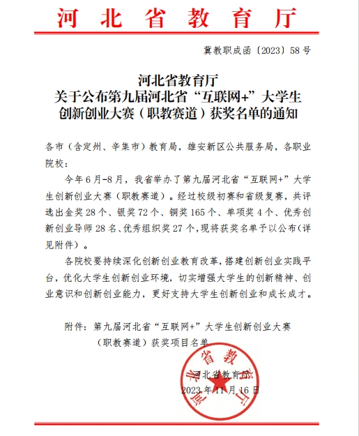 近日,由河北省教育厅、中国建设银行河北省分行主办,河北工业职业技术大学承办,北京智投网络科技有限公司、新道科技股份有限公司、新产教河北信息科技有限公司协办的第九届河北省“互联网+”大学生创新创业大赛(职教赛道)获奖名单揭晓。经过大赛激烈角逐,伟德官网参赛团队在本届大赛中共斩获金奖1项,并入围国赛,铜奖3项,获奖比例及个数再创历史新高。