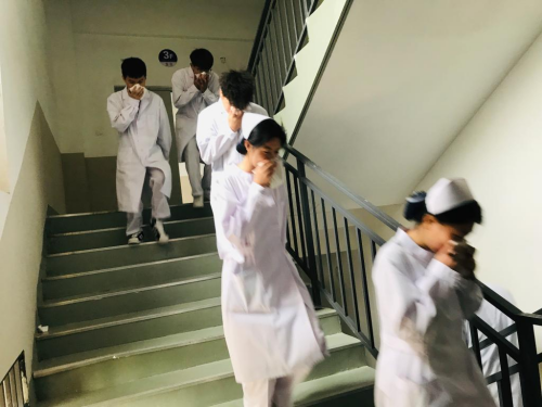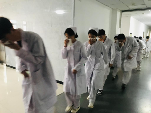 警铃一响,学生们迅速从消防通道撤离。只见他们一个个表情严肃,用湿毛巾捂住口鼻,迅速而有秩序的从通道口撤离“火灾”现场。楼内疏散人员按照预先的消防演习方案疏散学生,保证在楼内学生的安全,以免慌乱中出现拥挤或者踩伤现象。学生们逃生到实训楼外之后,按照相应队伍排成方队。