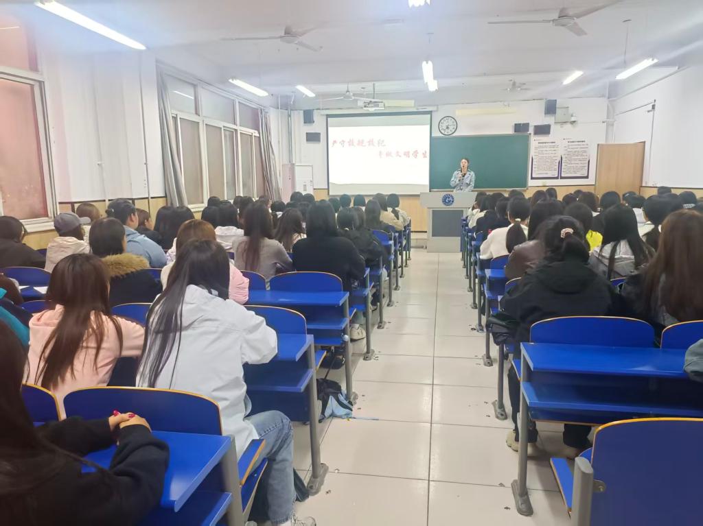 校规校纪再教育板块,辅导员结合《学生手册》,对课堂管理、违纪处分实施、宿舍管理规定等内容深入解读,通过以案说法、互动问答等形式,让纪律准则入脑入心,引导学生自觉知规守矩,以严谨治学态度开启大学生活。