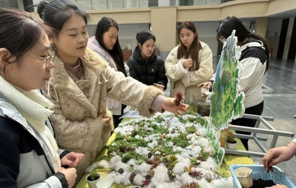 同步开展的多肉种植体验活动同样暖意融融。同学们亲手培土、栽苗、养护,以回收咖啡渣改良土壤,在触摸泥土、培育生命的过程中,真切感知生命成长的力量,将环保理念从思想认知转化为实际行动,也为学前教育自然启蒙课程积累了鲜活生动的实践素材。